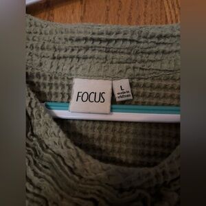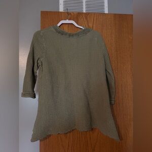 Textured olive green top. 3/4 sleeves. In great used condition. Size large. In my opinion, it is a little on the longer side (tunic-like), so would go great with leggings!
