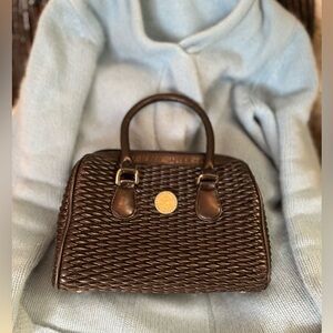The impressed logo hardware pieces are not turning colors, and are a nice rich gold color. 4 metal feet to keep bottom nice. All surfaces are woven (except bottom), and inside tag tells us material is leather. 9x7x4” size is perfect. I know I received this within the past 5 years or so, but can’t say if it’s vintage or contemporary , and please don’t ask me to ask Mr. Gifter for more info, cause that’s not happening :)