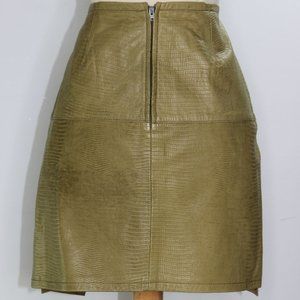 For purchase is this pre-loved soft, sublime spring green, textured leather skirt, lined, with functioning side buckle by Italian designer Henry Beguelin.