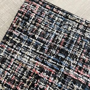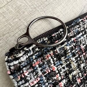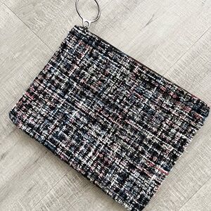 This is a beautiful multi color, rich black, blue, pink, grey, white, metallic threads tweedy fabric clutch with dark grey metal pull ring. Such a versatile clutch and in excellent condition. Opens quite big so can carry all your essentials. Very versatile.
