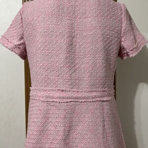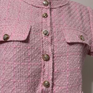 mini dress, A-line dress, short sleeve dress, pink, blush, pastel rose, tweed fabric, textured weave, structured material, collared neckline, button front, pocket detail, tailored fit, preppy style, chic, elegant, polished, office wear, daytime outing, brunch outfit, spring summer fashion, timeless, classic, sophisticated, stylish, trendy, feminine, versatile