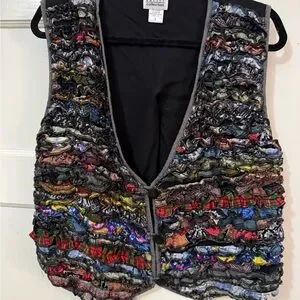 Vibrant ruffled vest with layered fabric strips. Deep V-neck and single-button front. Bold mix of colors throughout. Lightweight lined interior. Eye-catching layered texture