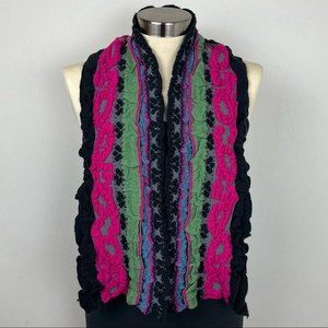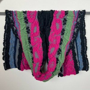 Textured Multicolored Sparkle Knit Stretch Scarf, pre-loved EUC, colors include Pink, Green, Black, and Gray. No care or content tags present. Fabric is soft and stretchy with a sweater feel and some sparkle. Slight wear on edges.