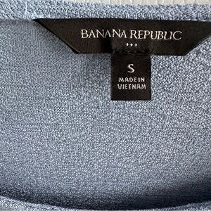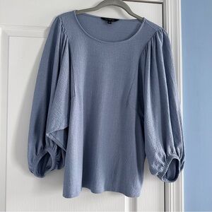 Textured fabric in “shark blue” with exaggerated puff sleeves that are about 3/4 length. Only worn a handful of times. No flaws. From smoke and pet free home.