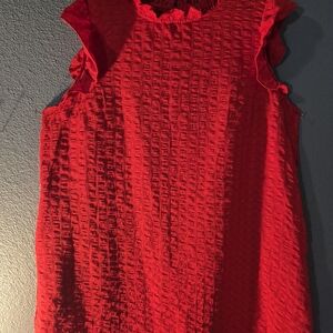 Elegant red formal dress with textured fabric and subtle ruffle cap sleeves. Lightweight, structured material creates a polished silhouette ideal for events. Easy to dress up with accessories for a refined look.