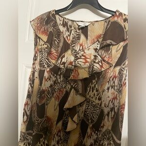 Gently used multi print blouse with ruffled color proceeding down the middle. Light weight. Ribbed and flowy.