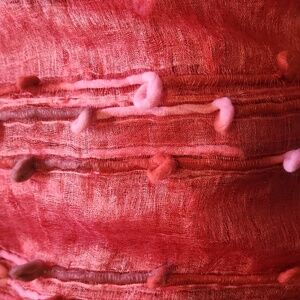 Lightweight red scarf with textured looped yarn accents. Semi-sheer fabric and decorative fringe. Soft, airy drape perfect for layering. Approx measures 28" wide, & about 60-64" long