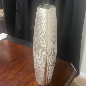 Elegant textured silver vase with a unique pattern. Perfect for modern decor.