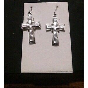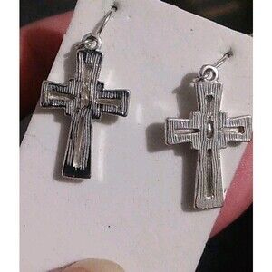 Textured Silvertone Cross Earrings With Clear Rhinestones