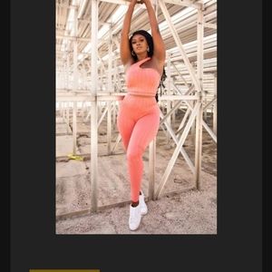 Coral colored textured sports legging and asymmetrical top. Worn once to try on. Bottoms run big but comfortable.If you want them seperately , you can request it.