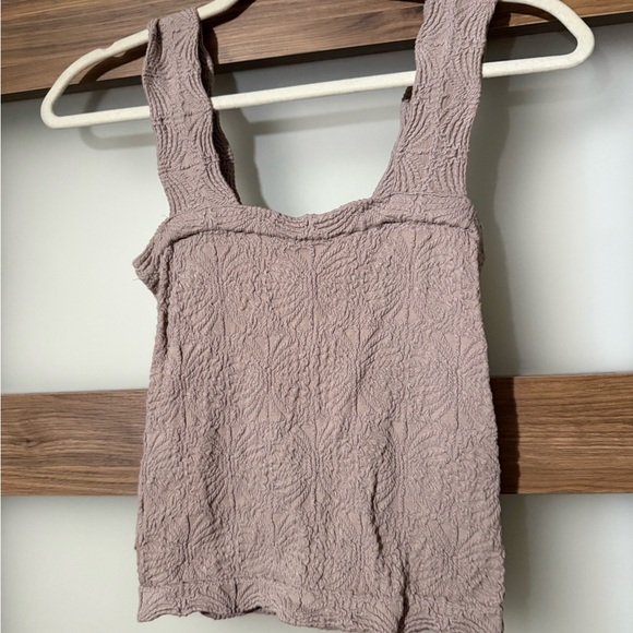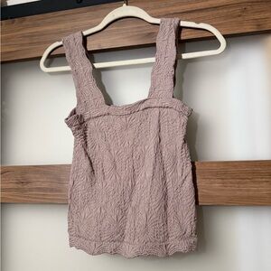 Square neckline with wide straps. Crinkled textured knit for subtle detail. Dusty mauve shade for easy pairing. Lightweight and breathable for layering.