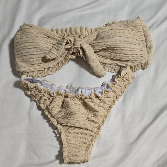Stylish textured bikini set in tan. Features a bandeau top with a knot detail and matching bottoms.