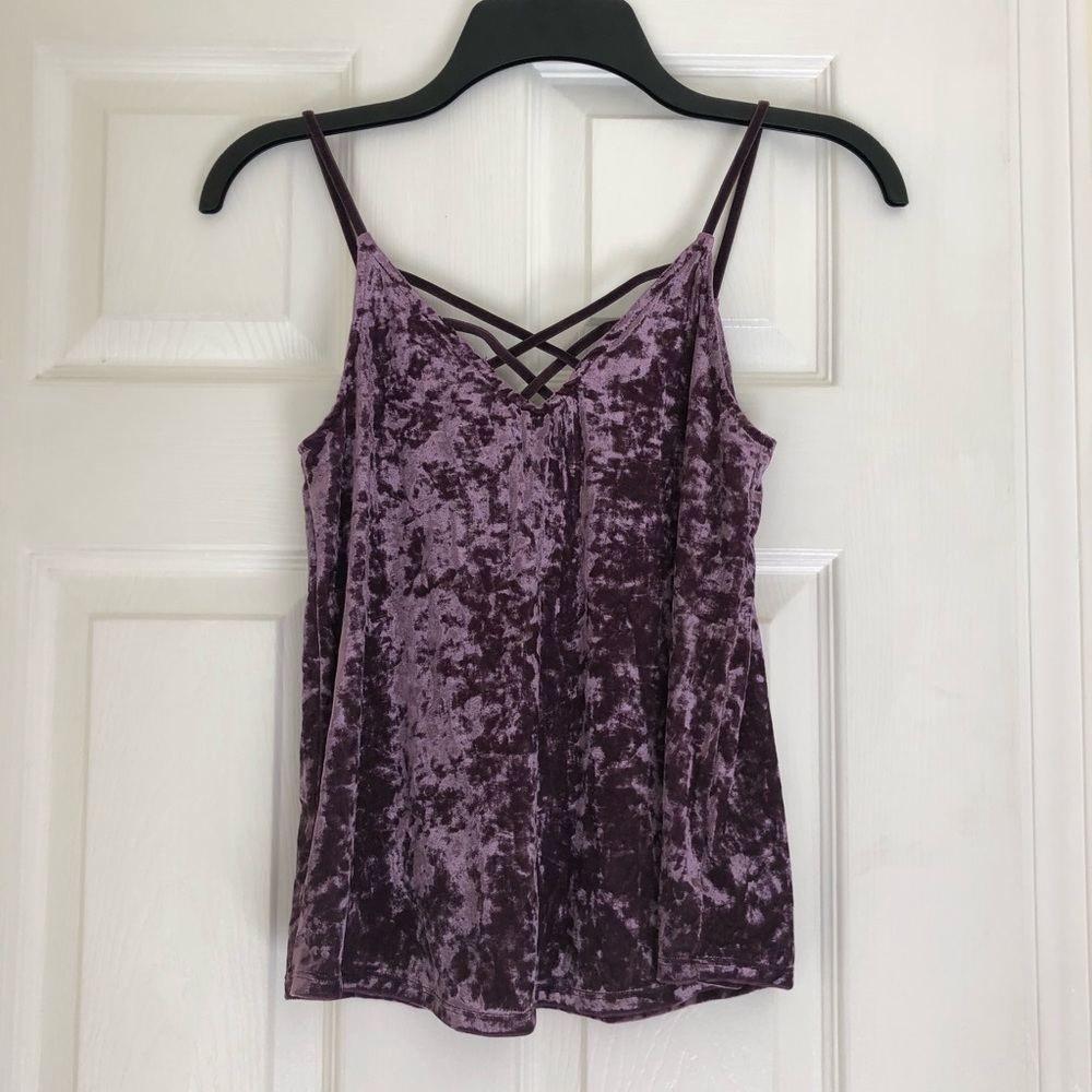 Purple textured American Eagle tank with front multiple string cross overs & back one string cross over