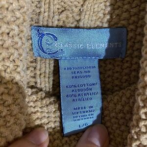 Classic Elements turtleneck sweater in tan with multi-stitch patterns throughout. Chunky knit, boxy style.