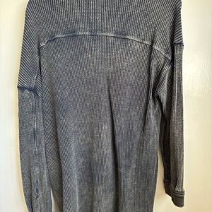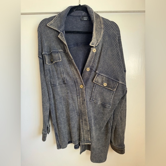 Lightweight textured shirt jacket with a washed, lived-in finish. Front button closure and dual chest flap pockets. Relaxed fit with a casual, oversized silhouette. Versatile layering piece. Great condition. Barely worn.
