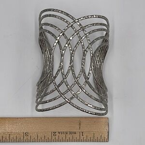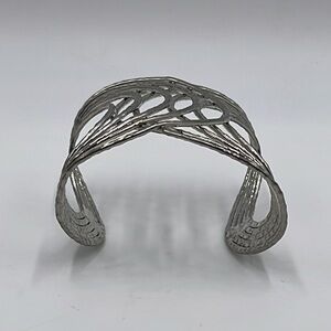 This textured metal cuff bracelet features a unique wired design, combining modern style with a bold statement. Its open cuff style makes it easy to wear, while the intricate details add depth and character. Perfect for adding an edgy touch to any outfit, whether casual or dressy. A great accessory for those who love standout pieces with a contemporary feel.