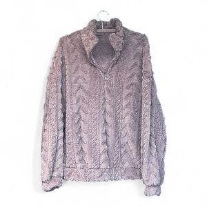 Stay warm and stylish with this cozy mauve textured jacket. Perfect for layering, this jacket adds a touch of elegance to any outfit.