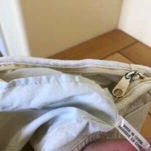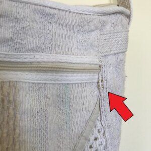 Vintage 90s textured woven fabric shoulder bag has top zip closure, large main compartment with small inner side pocket. Outer pocket with zip closure. Pre-owned vintage condition: has blue discoloration to inner lining, small section of outer woven fabric is loosely woven (see photo with red arrow). Note that paint is rubbed off of zipper pulls. 11 long x 9 tall x 2 1/2 thick. Strap is 36 long.