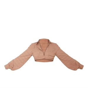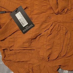 Peanut butter colored cropped shirt. Braley detailing with functional button. Note: True color of shirt is on the last two pictures and is darker then shown on model. BRAND NEW, TAG STILL ATTACHED. Collared. Size 12 in Women's.