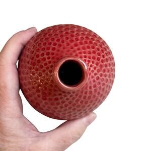 Textured red ceramic bud vase honeycomb small ovoid shape porcelain 4.5" tall