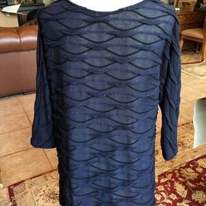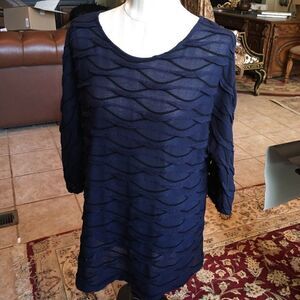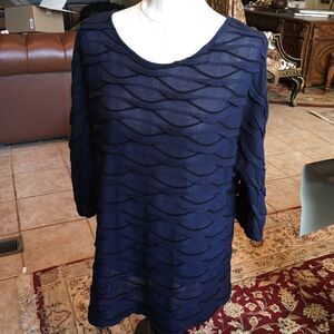 Textured Navy 3/4 Arm Length Top! Love this! It has a cotton textured design & feel but it is Poly! It is shown on a size 6-8 mannequinn & is tagged XL. This is a great piece flexible for many occasions!