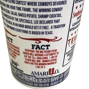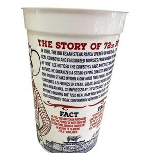 The Big Texan Steak Ranch souvenir plastic 22oz cup is a collectible advertising item featuring the famous restaurant chain's logo and branding. This original piece was created in 2025 in Amarillo, Texas, United States, making it a unique and sought-after item for fans of restaurants and fast food memorabilia. The white color and sign type advertising give it a classic and timeless look, perfect for displaying or collecting.