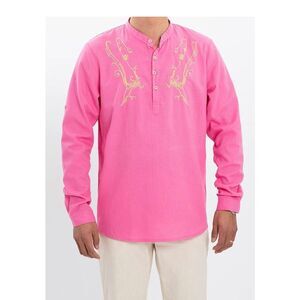 ThCreasa Mens Casual Long Sleeve Cotton Linen Henley Shirt Embroidery Summer Bea