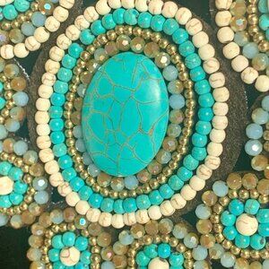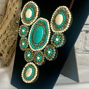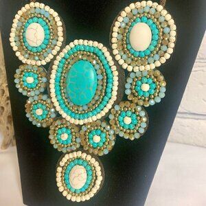 MATERIAL: Faux turquoise, howlite, ceramic beads, faceted acrylic beads, and metal beads.