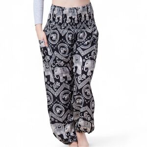 Very cool and comfy traditional style harem pants with a smocked elastic waistband from Thailand! (Purchased on a trip and have a few more to list) Super cute elephant print mix and side patch pockets.