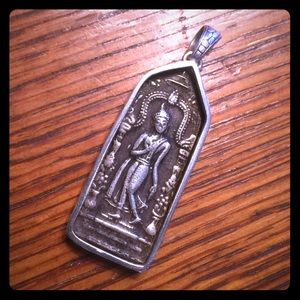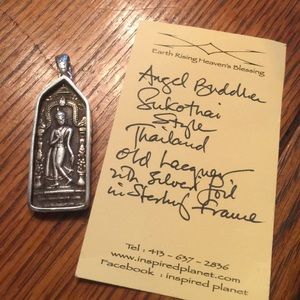 Rare Sukothai style standing Angel Buddha is a piece of old lacquer off of a larger ancient artifact. Layered in silver foil to accent the intricate details. Sterling silver frame and John Hardy-like bail (not stamped but tested and guaranteed). Bought at the coolest little shop called Inspired Planet in the Berkshires where the owner travels throughout Asia during the winter months before he curates a collection that has been written about in the NY Times. Approximately 2" tall x .75" wide.