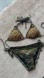 Stylish and vibrant, this embellished triangle bikini set is perfect for a day at the beach. Featuring intricate beadwork in orange, green, and black, it offers a unique and eye-catching design.