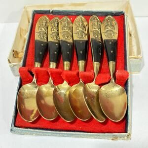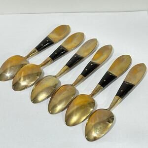 Thailand brass & teak spoons set - these are cocktail or desert sized perfect for espresso, tea or other demitasse drinks or small confections. This is a boxed set of 6 in the original box. The box is falling apart but the spoons have been well stored and are in excellent vintage condition. Add these to your collection today!