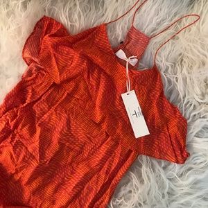 This print poplin dress features a scoop neck and a bodice overlay. Racer back. Spaghetti straps. Tangerine and terracotta Thakoon Addition sleeveless maxi dress with abstract print throughout, scoop neck and zip closure at side.