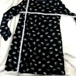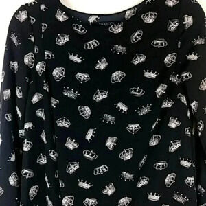 Thakoon for Design Nation Black Long Sleeve Shift Dress, Novelty Royal English Crown Print, Lightweight Crepe Dress with a Flowy Comfortable Fit, Size XS, Extra Small. Style Profile: Novelty Print, Royalty, Queen, Baddie, Punk, Goth, Grunge, Dark, Event, Statement, Fun, Unique. Smoke Free Home, Fast Shipping!