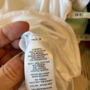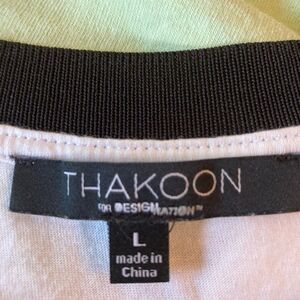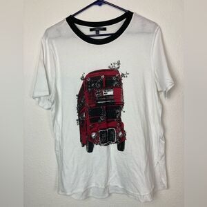 Such nice material never worn bought as souvenir in London. Nice blend of modal, cotton, nylon. Great rounded side vents. Black color and detailed bright red English double decker bus going to Portobello Road. No wear no flaws. Lightweight great to wear alone or layer . Pit to pit 21” shoulder to hem 26”. Many Thakoon fans collect. Bought in UK.