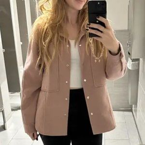 Pink wool blend (50% Wool 50% Polyester) Shacket. Long sleeves. Collar. Front snap closure, snaps are silver in color. 28" from shoulder to hemline. Imported.