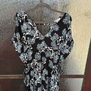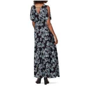 Black printed crepe de chine (100% viscose). Maxi. Short Sleeves. V-neckline. See size and fit notes for length. 22" side slit. Imported