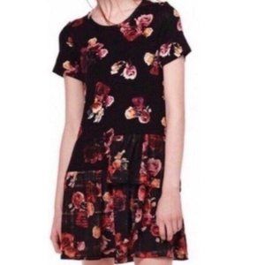 Thakoon For Design Nation, Women’s Short Sleeve, Scoop Neck, Tiered Ruffle Crepe Hem, Rose Print Drop Waist Mini Dress