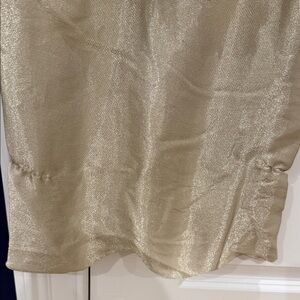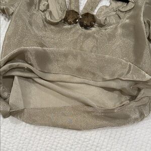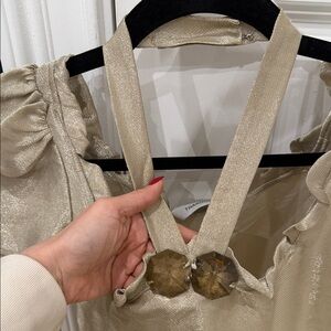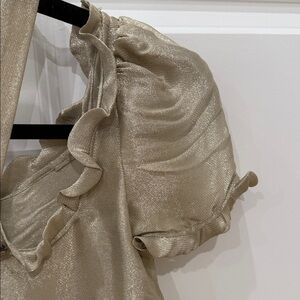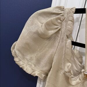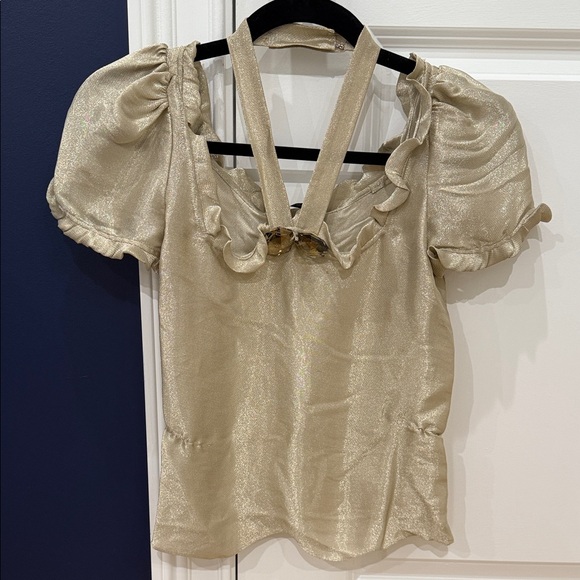Chic gold blouse with ruffled neckline. Short puff sleeves. Halter strap detail.