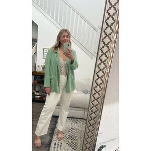 Green linen blend (70% Rayon, 30% Linen). Blazer. Long sleeves. Collar. Front button closure. 30" from shoulder to hemline. Imported.