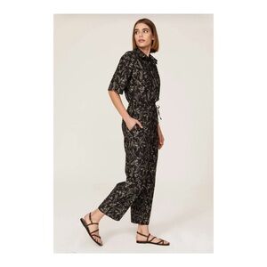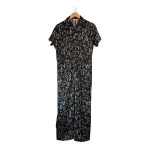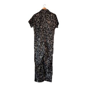 Jumpsuit. Collared neckline. Short sleeve. Front button fly closure. 50" from shoulder to hemline. 24" inseam, 12" rise, 17.5" leg opening.