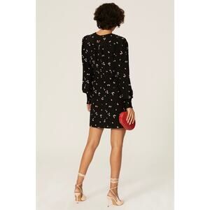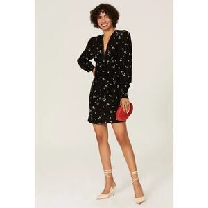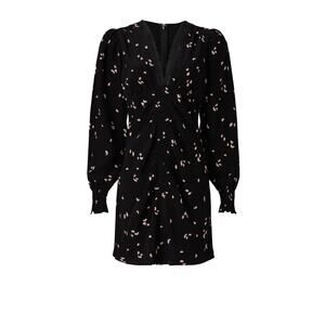 Black floral chiffon (58% Rayon, 42% Viscose). Hourglass. V-neckline. Long sleeves. Back zipper closure. 35" from shoulder to hemline.pit to pit 20” waist 32”