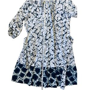 Effortlessly chic Thakoon for Target mini shirtdress featuring a beautiful blue and white shibori tie-dye print. This dress boasts a button-front closure, a flattering belted waist to cinch your silhouette, and comfortable elbow-length sleeves. The lightweight fabric makes it perfect for warmer days and versatile enough for a range of occasions. A stylish and unique piece to elevate your wardrobe!