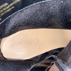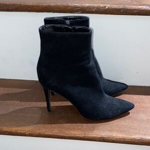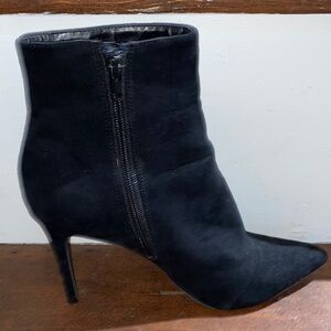 Chic black heeled faux suede boots by Thalia Sodi w/ pointed toe. Sleek design with a stylish silhouette, heel height is approx 3”.