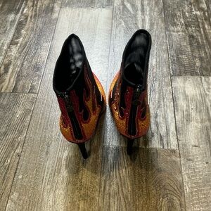 Bold heeled boots with striking black and orange design. Perfect for a standout look.