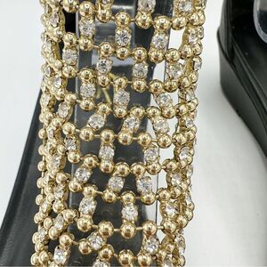 Gold-tone mesh with rhinestone embellishment at T-strap