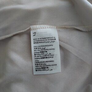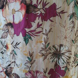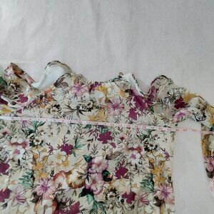 Size large floral cold shoulder top with chain strap. Long sleeve with elastic hem. Armpit to armpit 22". Fully lined 100% polyester. Shell is 98% polyester and 2% metallic