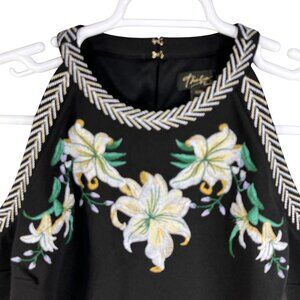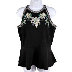 Women's top floral embroidery black peplum chevron trim Talia Sodi chic fashion sleeveless blouse elegant top medium size polyester feminine style trendy clothing embroidered flowers