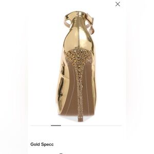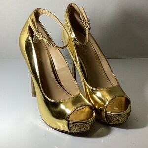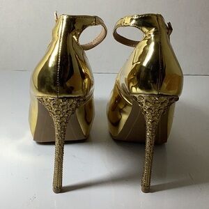• Round-toe ankle-strap platform pumps with adjustable buckle closure
