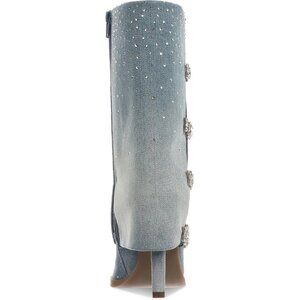 The Thalia Sodi Nami Embellished Dress Boots in Ombre feature a pointed toe, 4" stiletto heel, and cuffed shaft adorned with chain embellishments. Crafted from fabric upper and lining with a cushioned insole and flexible rubber sole, these boots offer style and comfort. The functional inside zipper closure ensures easy wear, making them ideal for evening events, dressy occasions, or fashionable outings.